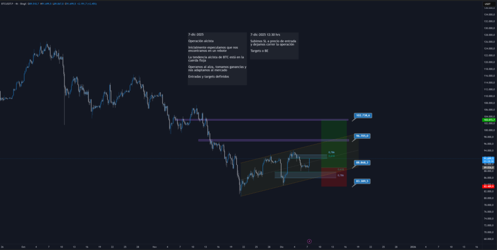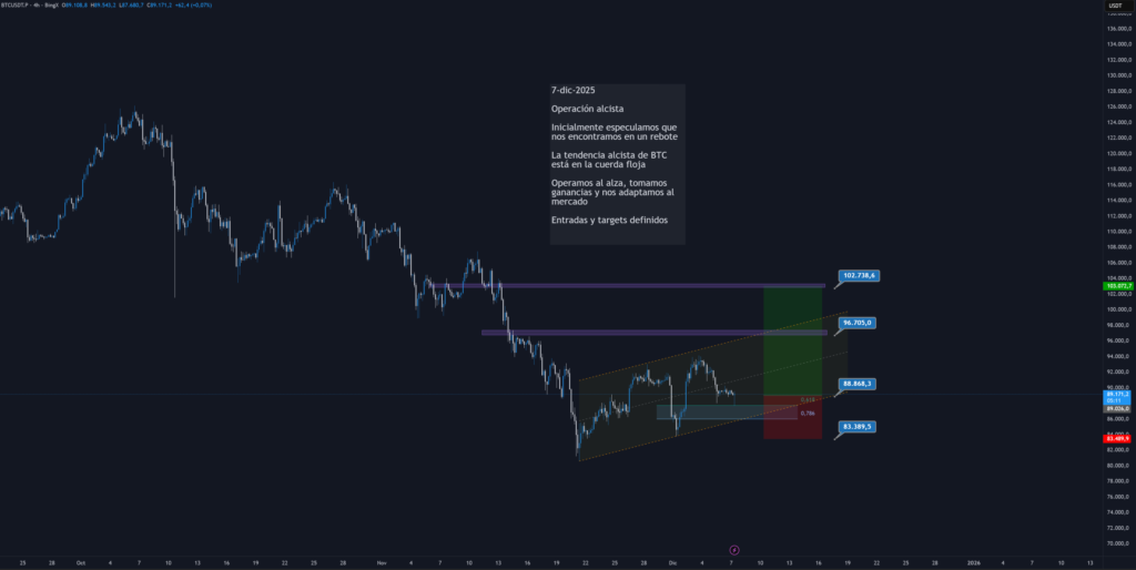 Esta zona nos va permitir determinar si BTC hace una lateral para continuar con su caida o bien formará un suelo para intentar recuperar la tendencia en marcos mayores que es de momento alcista, en peligro pero aún alcista.