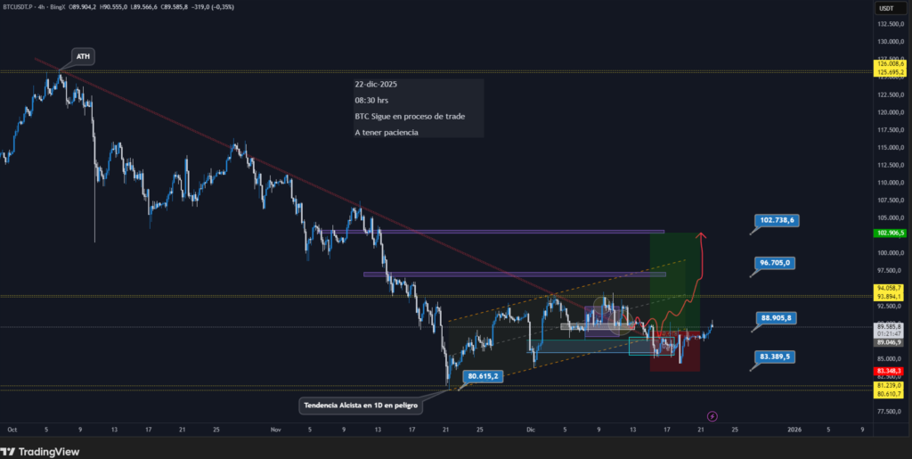 Aunque parezca repetitivo, BTC sigue en la misma zona. Este comportamiento es típico de BTC, está terminando con la paciencia de todos no tiene decisión. Lo negativo de este tipo de comportamientos es que de la naa hará un movimiento muy bursco y rápido que no permiirá reaccionar y tratar de operarlo con mayor tranquilidad, a respetar las zonas de fibonacci y la gestión del riesgo.