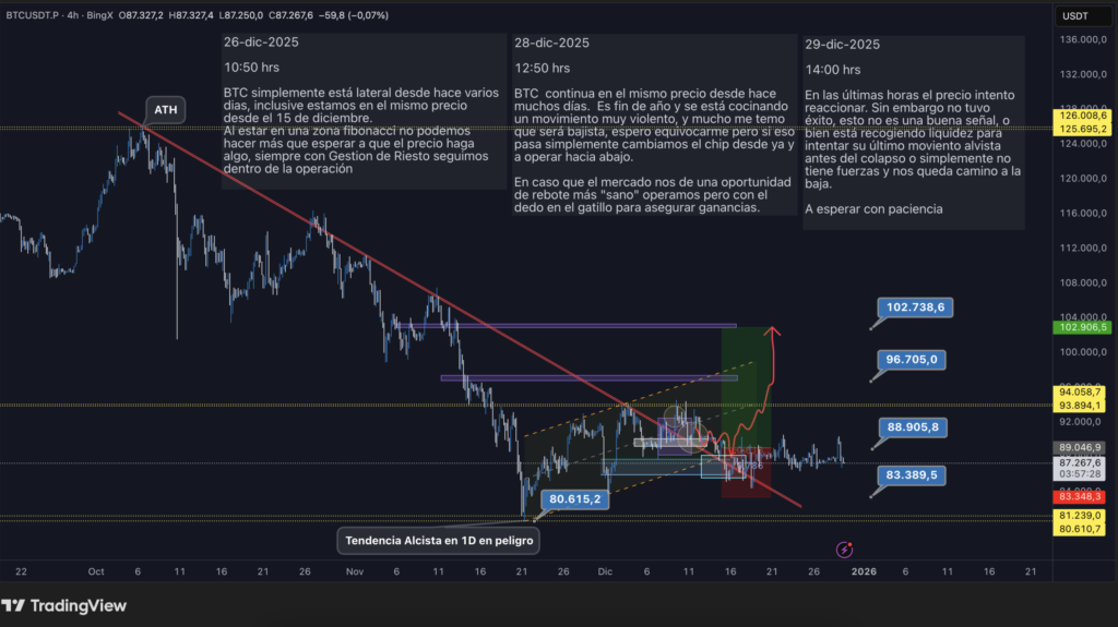 En las últimas horas el precio intento reaccionar. Sin embargo no tuvo éxito, esto no es una buena señal, o bien está recogiendo liquidez para intentar su último movimiento alcista antes del colapso o simplemente no tiene fuerzas y nos queda camino a la baja.
