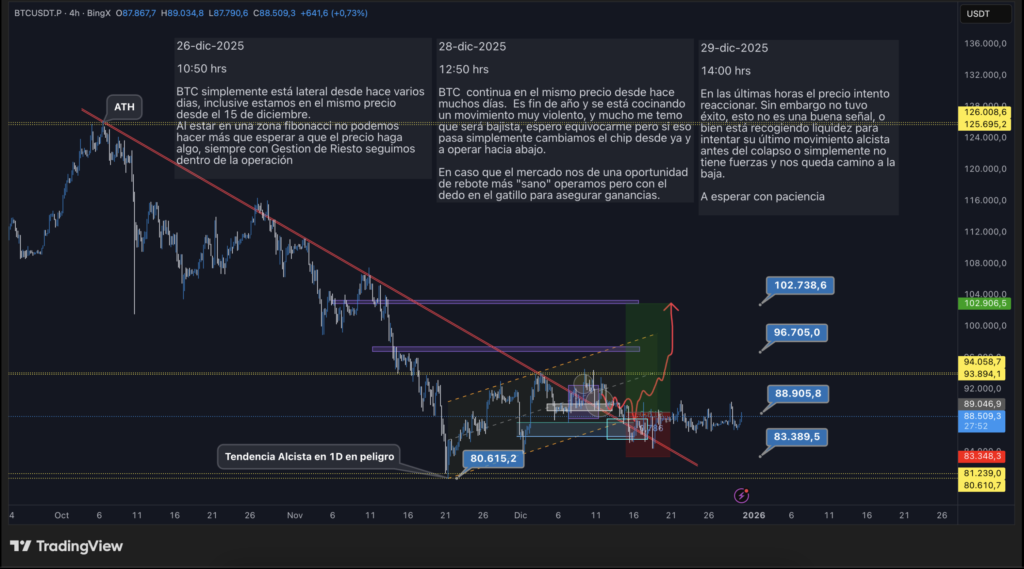 Por ahora lo único que queda es observar, seguimos dentro del trade aunque lamentablemente nos van a comer a comisiones ya que llevamos varios dias dentro. Voy a evaluar la posibilidad en los primeros dias de Enero pasarme a una cuenta en Quantfury donde no cobran comisiones por mantener los trades abiertos para que en el futuro nos ahorremos unoa dolares.