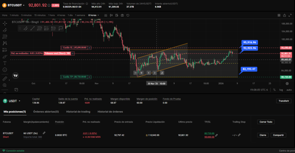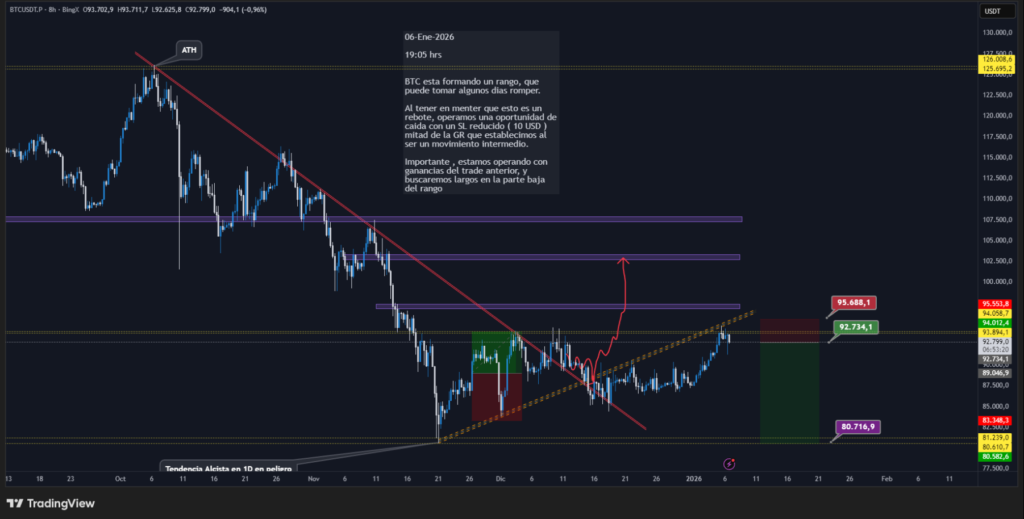 BTC esta formando un rango, que puede tomar algunos dias romper. Al tener en menter que esto es un rebote, operamos una oportunidad de caida con un SL reducido ( 10 USD ) mitad de la GR que establecimos al ser un movimiento intermedio.