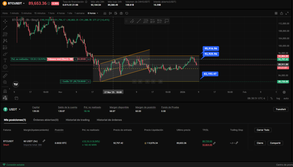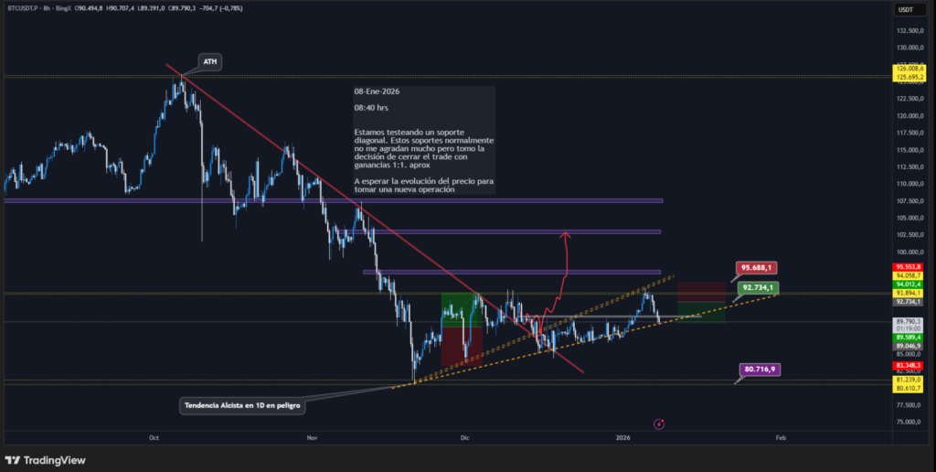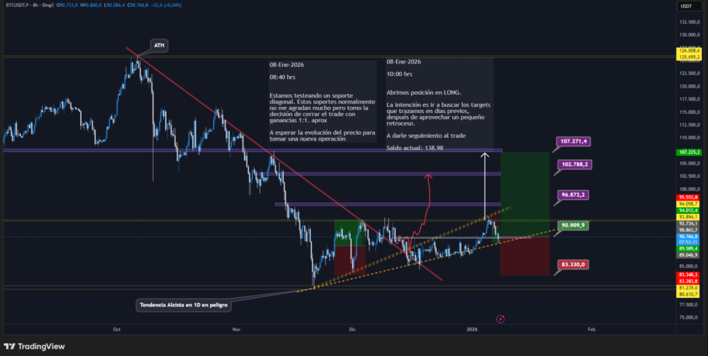 Estamos testeando un soporte diagonal. Estos soportes normalmente no me agradan mucho pero tomo la decisión de cerrar el trade con ganancias 1:1. aprox