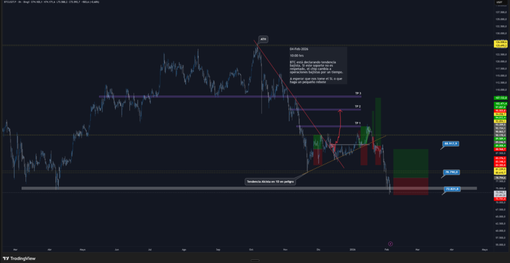 BTC está declarando tendencia bajista. Si este soporte no es respetado, el chip cambia a operaciones bajistas por un tiempo.